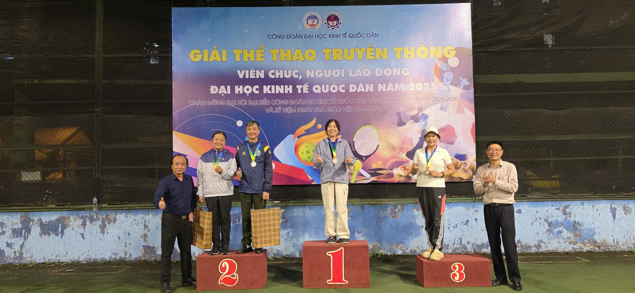 🎾 Đôi Nam – Nữ:🥇 Giải Nhất: Nguyễn Xuân Hưng – Trần Thị Thanh Nga (Viện Thương mại & Kinh tế Quốc tế)🥈 Giải Nhì: Trần Nam Sơn (Phòng Tổng hợp) – Trần Thạch Liên (Cựu Giáo chức)🥉 Đồng Giải Ba: