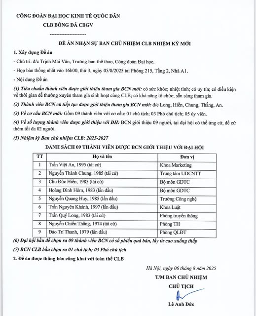 Thông báo Đề án nhân sư Ban chủ nhiệm CLB Bóng đá nhiệm kỳ mới