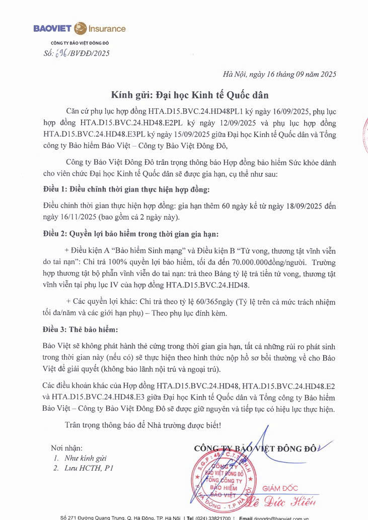 Thông báo Hợp đồng bảo hiểm Sức khỏe dành cho viên chức Đại học Kinh tế Quốc dân gia hạn