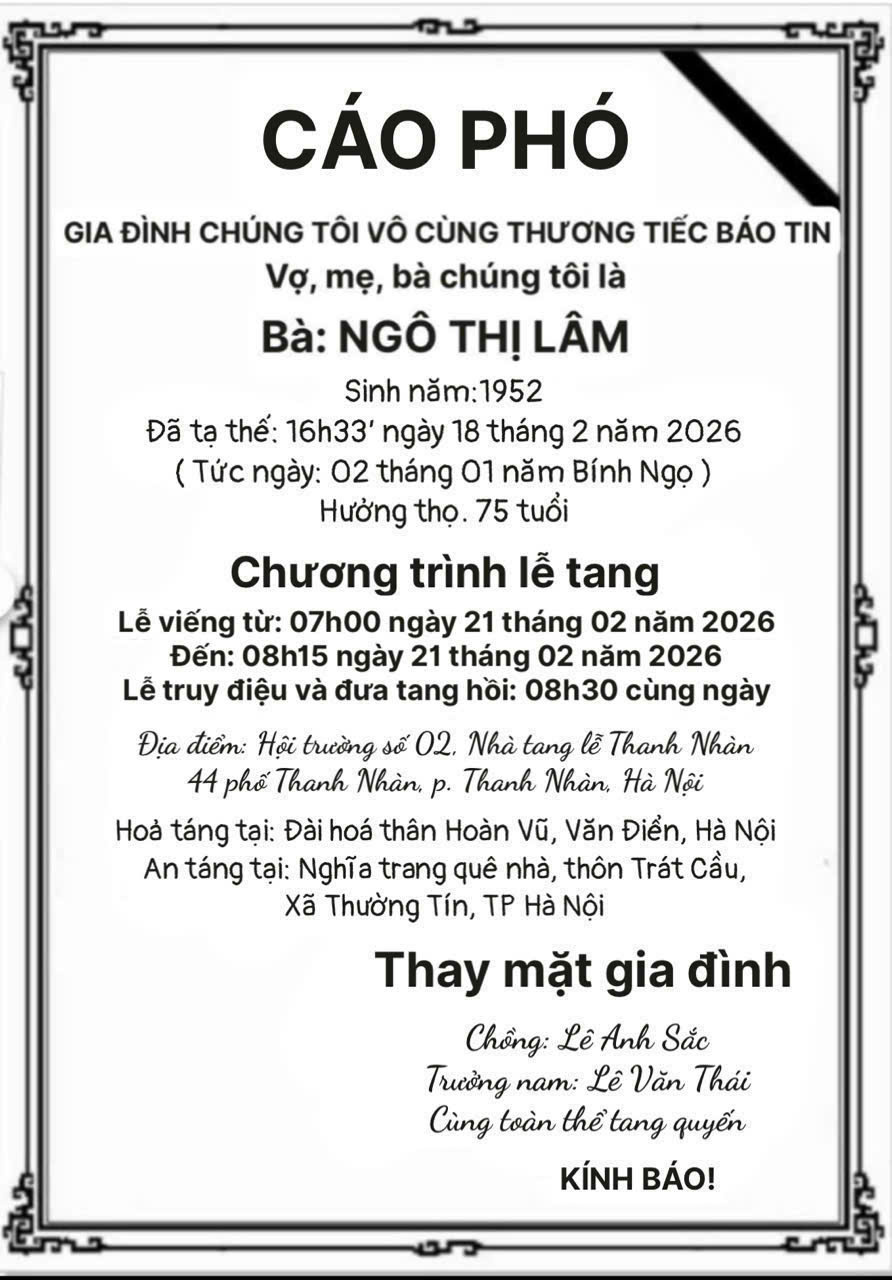 Công đoàn Khoa Bảo hiểm, Trường Kinh doanh cùng gia đình vô cùng thương tiếc báo tin:Bà: Ngô Thị Lâm, Sinh năm 1952Là mẹ chồng của TS Nguyễn Thị Chính, Trưởng khoa Bảo hiểm, Phó Hiệu trưởng Trường Kinh doanh Đã từ trần vào hồi: 16h33, ngày 18 tháng 02 năm 2026 (tức ngày 02/01 năm Bính Ngọ), hưởng thọ 75 tuổi.Lễ viếng từ 07h00 đến 8h15 ngày 21 tháng 02 năm 2026 tại Hội trường số 2, Nhà tang lễ Thanh Nhàn, 44 Phố Thanh Nhàn, Phường Thanh Nhàn, Hà Nội. Lễ truy điệu và đưa tang hồi 08h30 cùng ngày tại nhà tang lễ Thanh Nhàn. Hỏa táng tại Đài hóa thân Hoàn Vũ, Văn Điển, Hà Nội. An táng tại Nghĩa trang quê nhà Thôn Trát Cầu, Xã Thường Tín, Hà Nội. Công đoàn Khoa Bảo hiểm đã xin xe xuất phát lúc 6h30 ngày 21/02/2026 tại Nhà 9. Quý Thầy Cô đi cùng xe xin vui lòng liên hệ Cô Nhi: +84 97 5931118. Lịch trình: Nhà 9 - Nhà tang lễ - Đài hóa thân - Nhà 9. Trân trọng kính báo tới Thầy Cô.