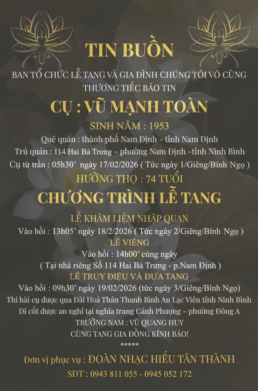 Công đoàn Khoa Kinh tế và Quản lý Nguồn nhân lực cùng gia đình vô cùng thương tiếc báo tin:Cụ: Vũ Mạnh Toàn, Sinh năm 1953Là bố chồng của TS Phạm Hương Quỳnh - Giảng viên Khoa Kinh tế và Quản lý Nguồn nhân lựcĐã từ trần vào hồi: 05h30, ngày 17 tháng 02 năm 2026 (tức ngày 01 tháng Giêng năm Bính Ngọ), hưởng thọ 74 tuổi.Lễ viếng vào hồi 14h00 ngày 18 tháng 02 năm 2026 ( tức ngày 02 tháng Giêng năm Bính Ngọ) tại Nhà riêng số 114 Hai Bà Trưng - Phường Nam Định - Tỉnh Ninh Bình.Lễ truy điệu và đưa tang hồi 09h30 ngày 19/02/2026.Hỏa táng tại Đài hóa thân Thanh Bình An Lạc Viên tỉnh Ninh Bình.An táng tại Nghĩa trang Cánh Phượng - Phường Đông A.Do đám tang vào đúng ngày đầu Xuân nên Công đoàn Khoa Kinh tế và Quản lý nguồn nhân lực đã xin xe tổ chức xuống thắp hương sau vài ngày vào sáng ngày 21/02/2026 ( tức ngày 05 tháng Giêng ). Xe xuất phát lúc 8h45 tại Nhà 9 ( cổng Trần Đại Nghĩa ).Quý Thầy Cô đi cùng xe xin vui lòng liên hệ cô Oanh: 0983734776Trân trọng kính báo tới Thầy Cô.